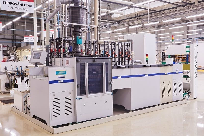 Matusewitz MECetch line – this process replaces the brushing process in some areas. Matusewitz MECetch line – this process replaces the brushing process in some areas. It brings far greater copper roughness and therefore it´s bigger surface. This treatment is suitable for application with dry resist, solder mask even for finishes pre-treatment. This technology is used also for copper surface treatment for flexi PCBs thanks to its minimal mechanical stress. Modern line software enables flexible program setting and simultaneously controls the automatic dosing based on continuous copper measurement.