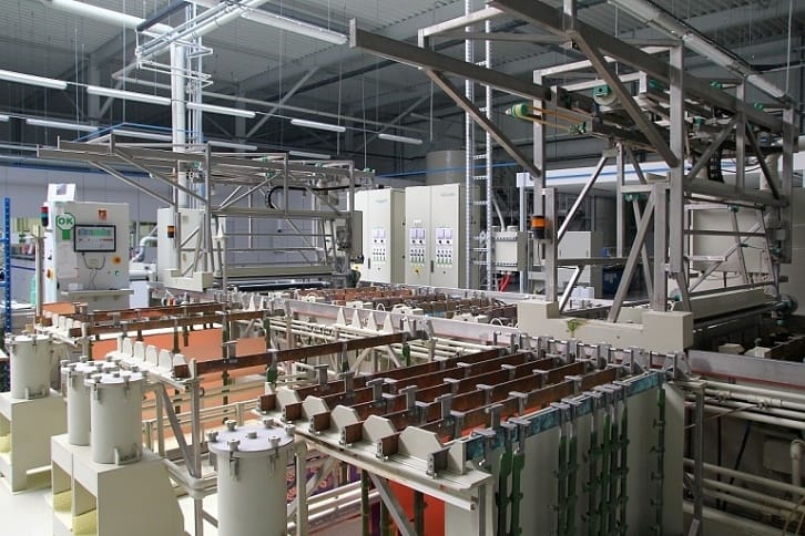 These lines are used for chemical treatment of semi-finished and finished plates. Processes include induction, etching, mechanical and chemical cleaning, surface pretreatment and activation and, most importantly, electroplating. Wet processes ensure the cleanliness and quality of the inner layers in particular and contribute significantly to the durability of the plate.
