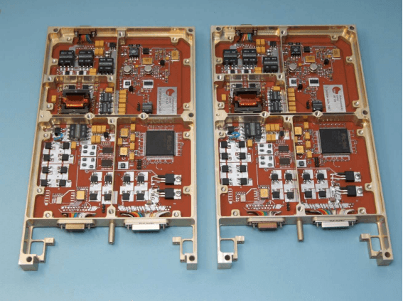 The circuit boards for the device were fitted with discrete components based on cold redundancy with very low noise DC/DC converters for deep space missions without optical or magnetic feedback. (1) Ground planes covered 95% of the area and two power planes were introduced under the FPGA. The main power switches are located near the edge of the PCB to increase resistance to thermal conduction flow into the power supply enclosure frame with the main electronics. No electrical components were connected to the frame itself, with the exception of the MDM interconnects, which are wired to the board.