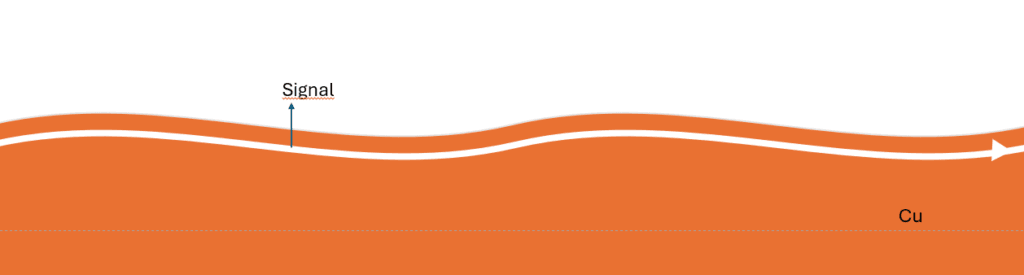 - 10 GHz: High frequency = long signal transmission path. However, copper does not exhibit as deep a skin effect as in the previous case, resulting in less signal attenuation. The signal tends to follow the surface roughness of the copper.